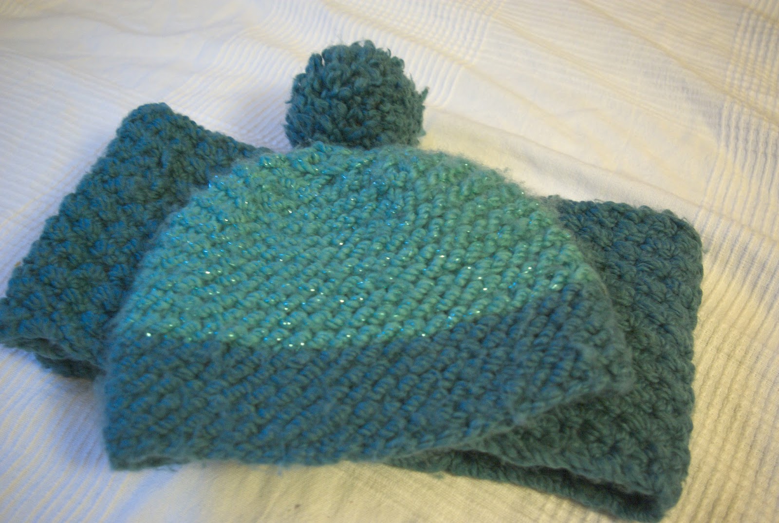 Ansonsten habe ich schon mal eine Mütze und Schlal aus türkiser Wolle gestrickt.